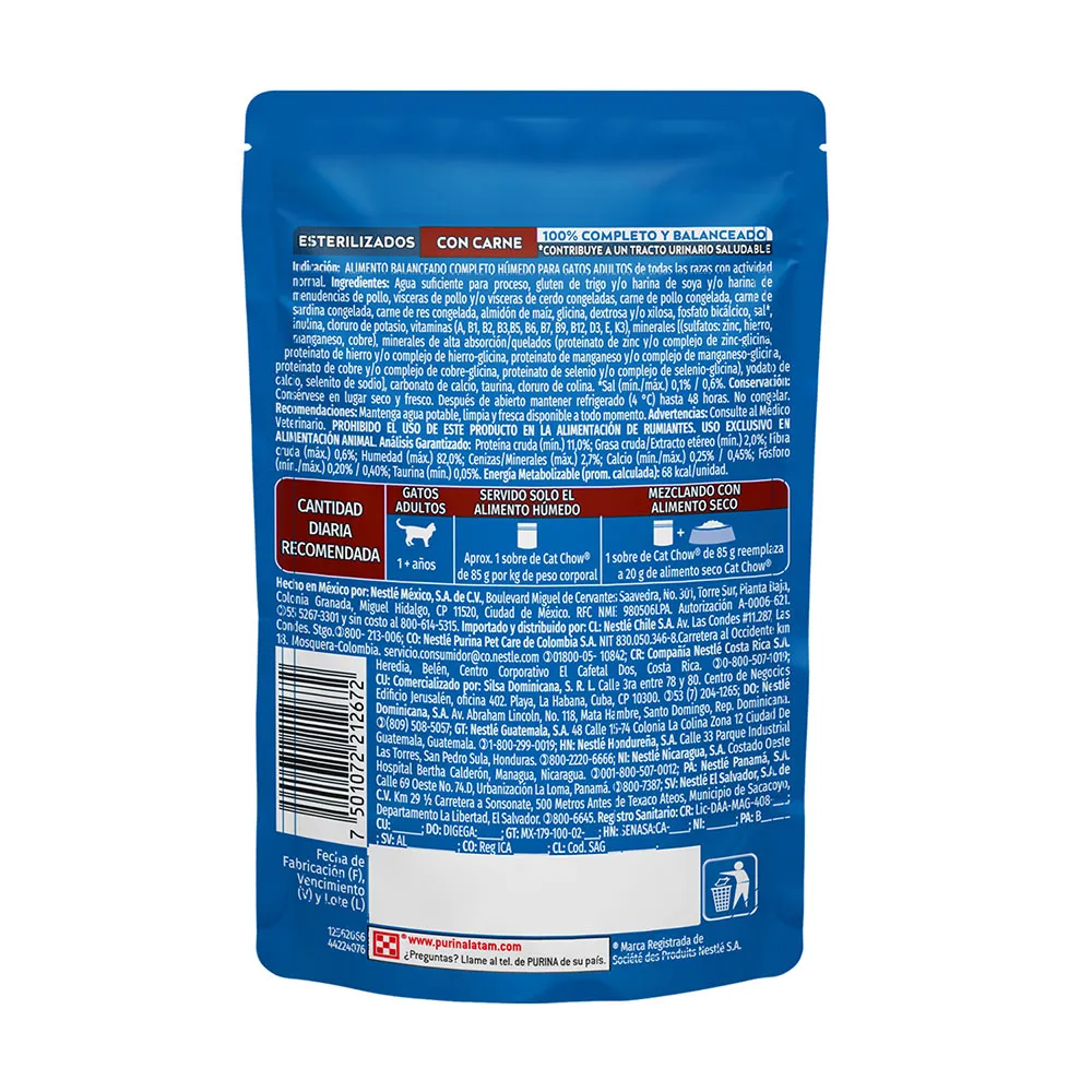 Divida la cantidad diaria en 2 o más raciones. Cuando se sirve con alimento seco, cada sobre de Cat Chow® equivale a 25 g (1/4 de taza de 200 ml) de Cat Chow® seco. Ajuste la alimentación para mantener la condición corporal ideal de su gato.