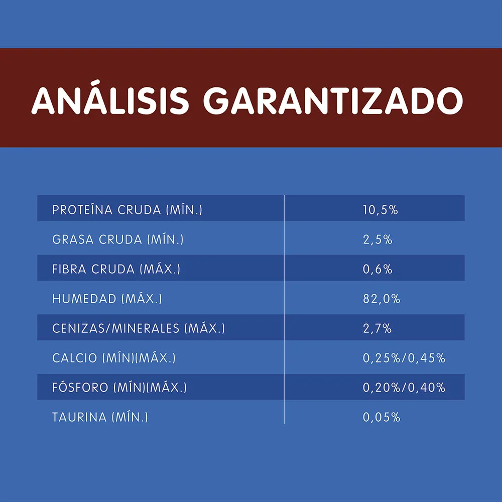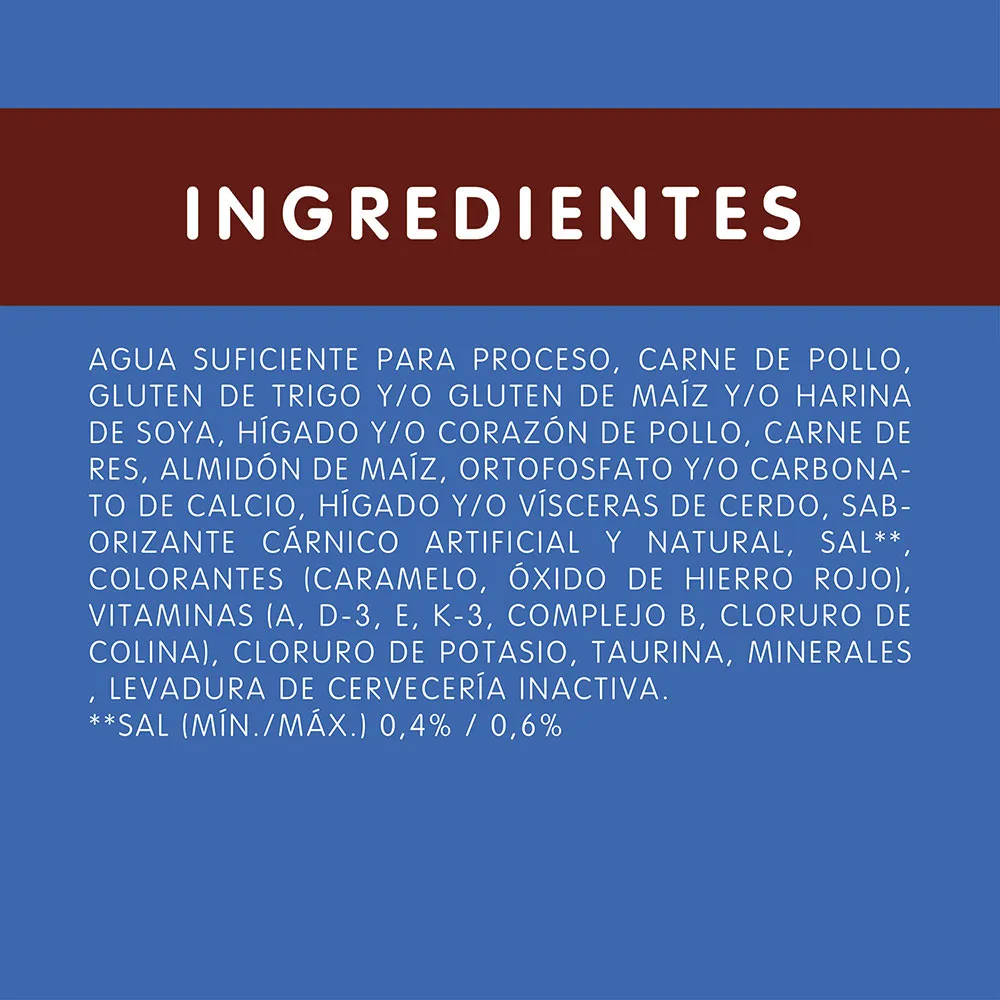 Agua suficiente para proceso, carne de pollo, gluten de trigo y/o gluten de maíz y/o harina de soya, hígado y/o corazón de pollo, carne de res, almidón de maíz, ortofosfato y/o carbonato de calcio, hígado y/o vísceras de cerdo, saborizante cárnico artificial y natural, sal**, colorantes (caramelo, óxido de hierro rojo), vitaminas (A, D-3, E, K-3, Complejo B, cloruro de colina), cloruro de potasio, taurina, minerales , levadura de cervecería inactiva.